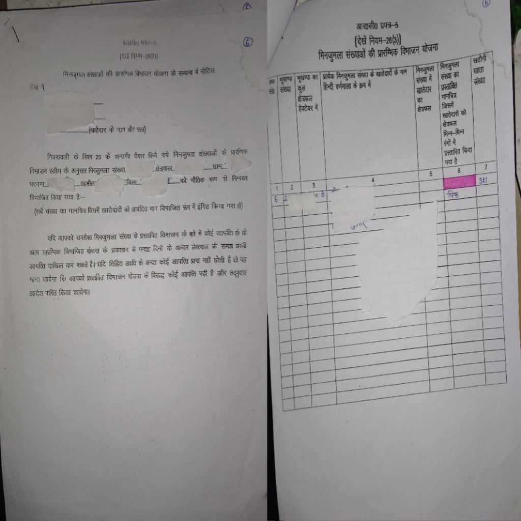 - मिलाजुला संख्याओं की प्रारंभिक विभाजन योजना के सम्बन्ध में नोटिस, जो सभी सह खातेदार को जायेगी। नियमावली के नियम 25 के अंतर्गत। इसमे कलर भी बताया जायेगा ।
