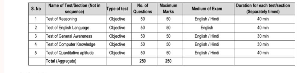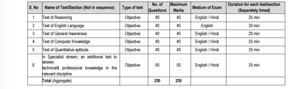 Objective Test: The Objective Test of 3 Hours duration consists of five & six sections for Generalists & Specialists respectively for total 250 Marks.